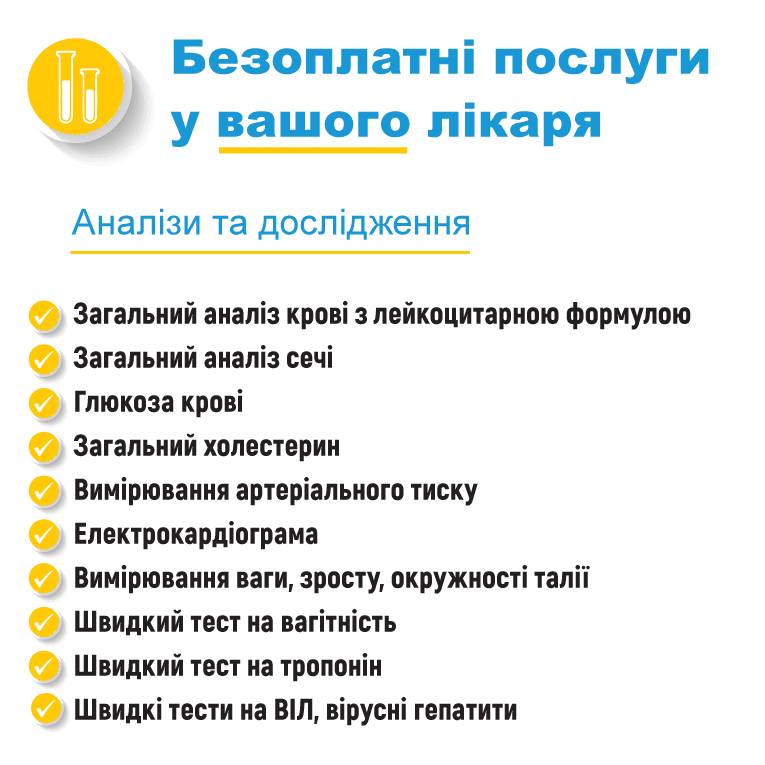 Безоплатні аналізи та дослідження. Сюди входить загальний аналіз крові з лейкоцитарною формулою, загальний аналіз сечі, глюкоза крові, загальний холестерин, електрокардіограма, швидкий текст на вагітність, швидкі тести на ВІЛ, вірусні гепатити.